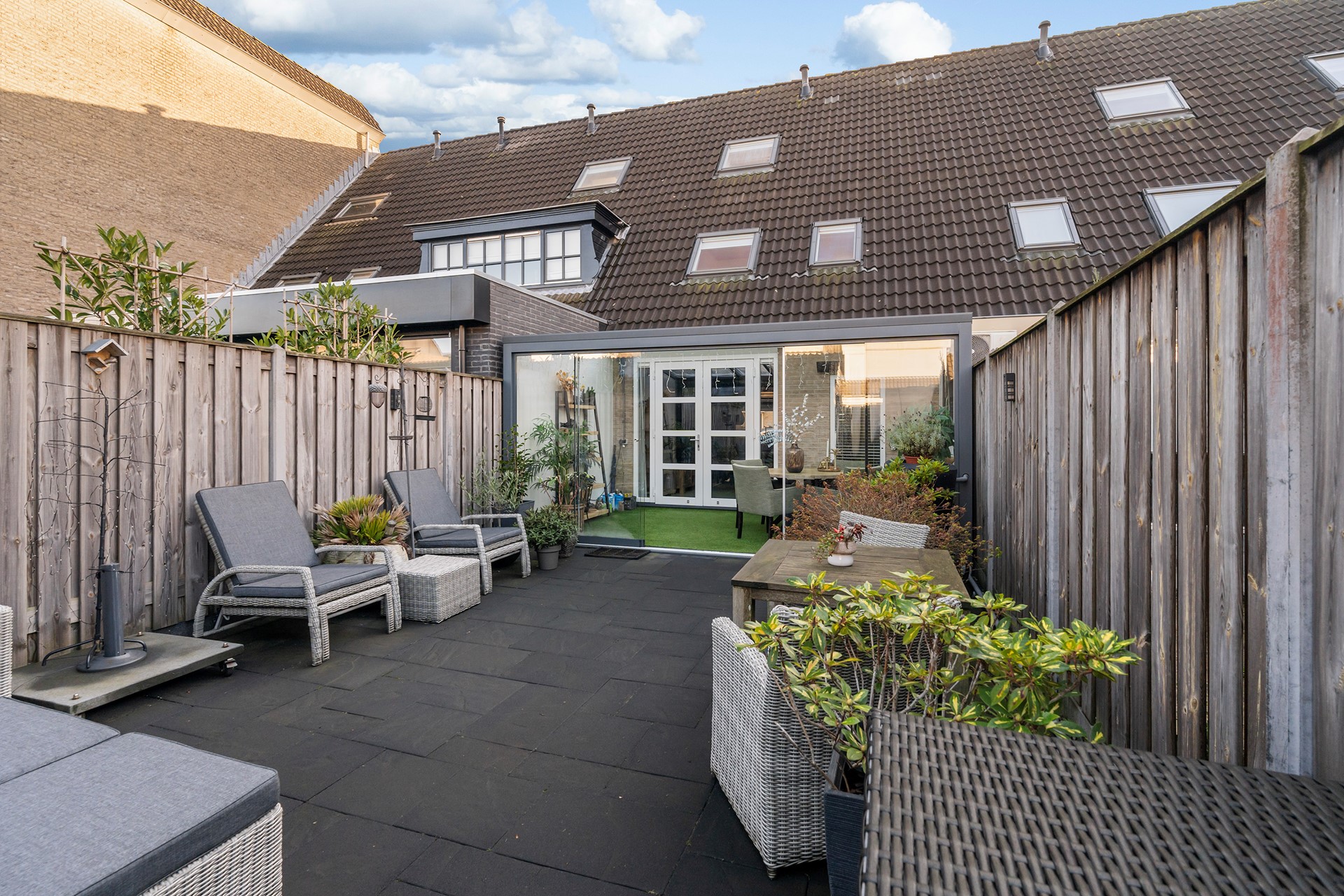 De achtertuin is gelegen op het noorden, maar door de serre en ligging tussen de bebouwing is er altijd wel een plekje in de zon of juist in de schaduw te vinden. De tuin is onderhoudsvriendelijk aangelegd en biedt volop ruimte voor een lounge- of eethoek. Er is ook een schuur aanwezig.
