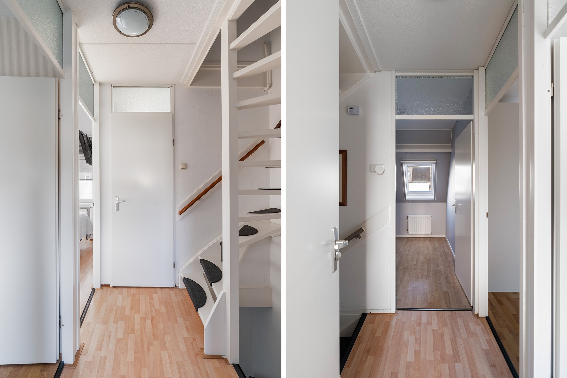 Via een vaste trap bereik je de zolderverdieping. Hier is de vierde slaapkamer gerealiseerd, licht en netjes afgewerkt met een dakraam voorzien van een hor. Daarnaast bevindt zich hier een praktische was-/stookruimte, perfect voor wasmachine, droger en extra opbergruimte.