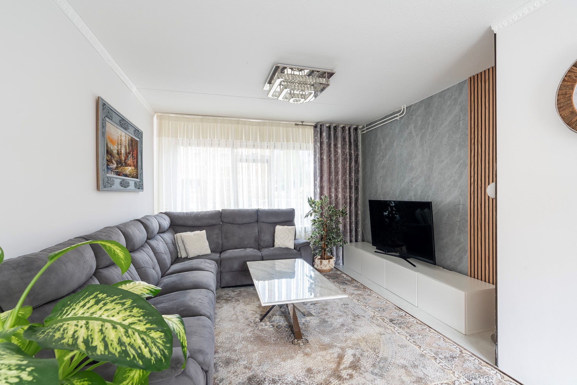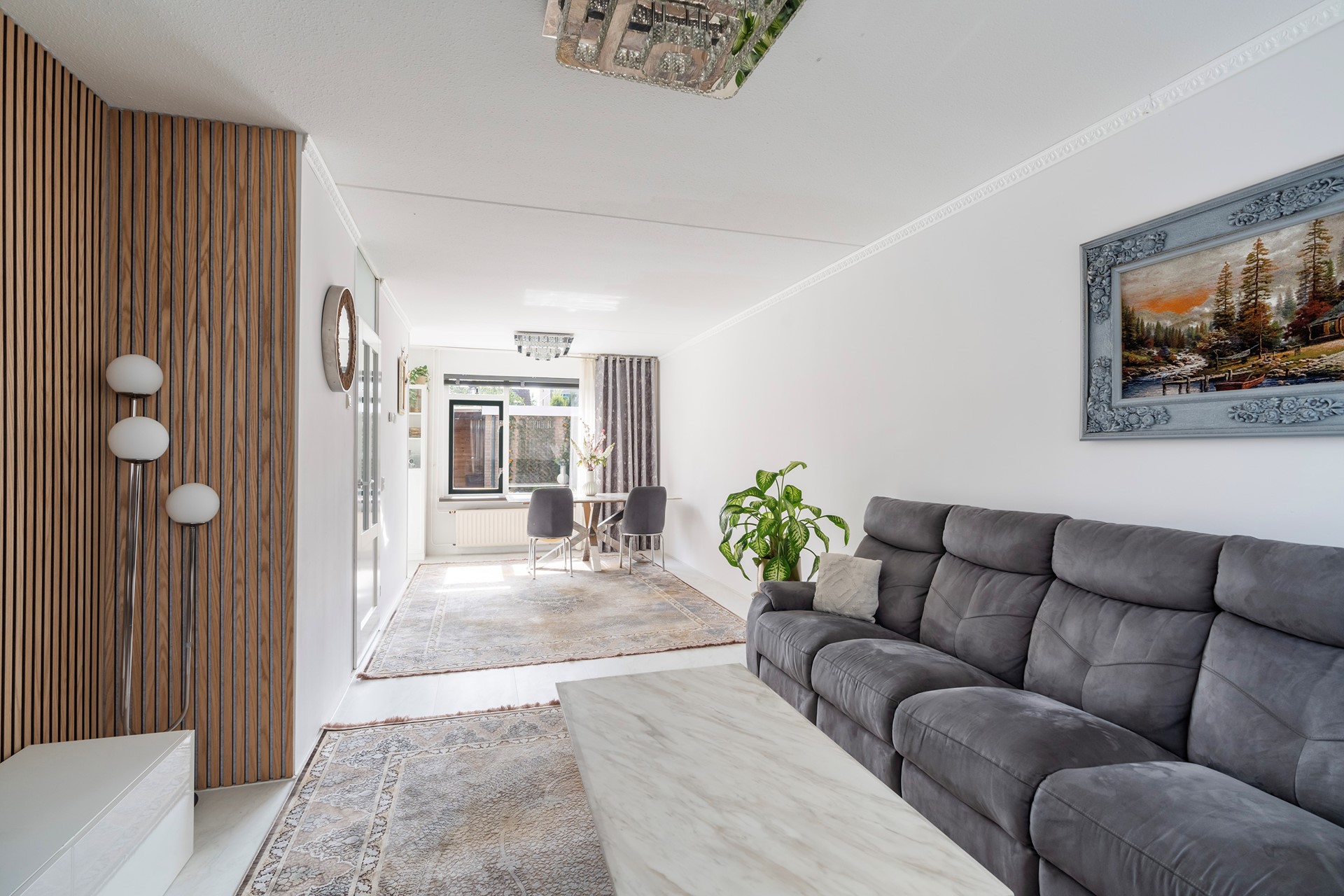 De gehele begane grond is in 2025 voorzien van nieuw, lichte laminaattegels welke nog voorzien is van garantie en de wanden zijn wit gesausd.