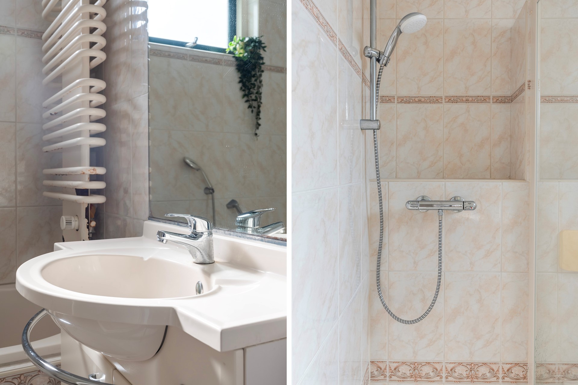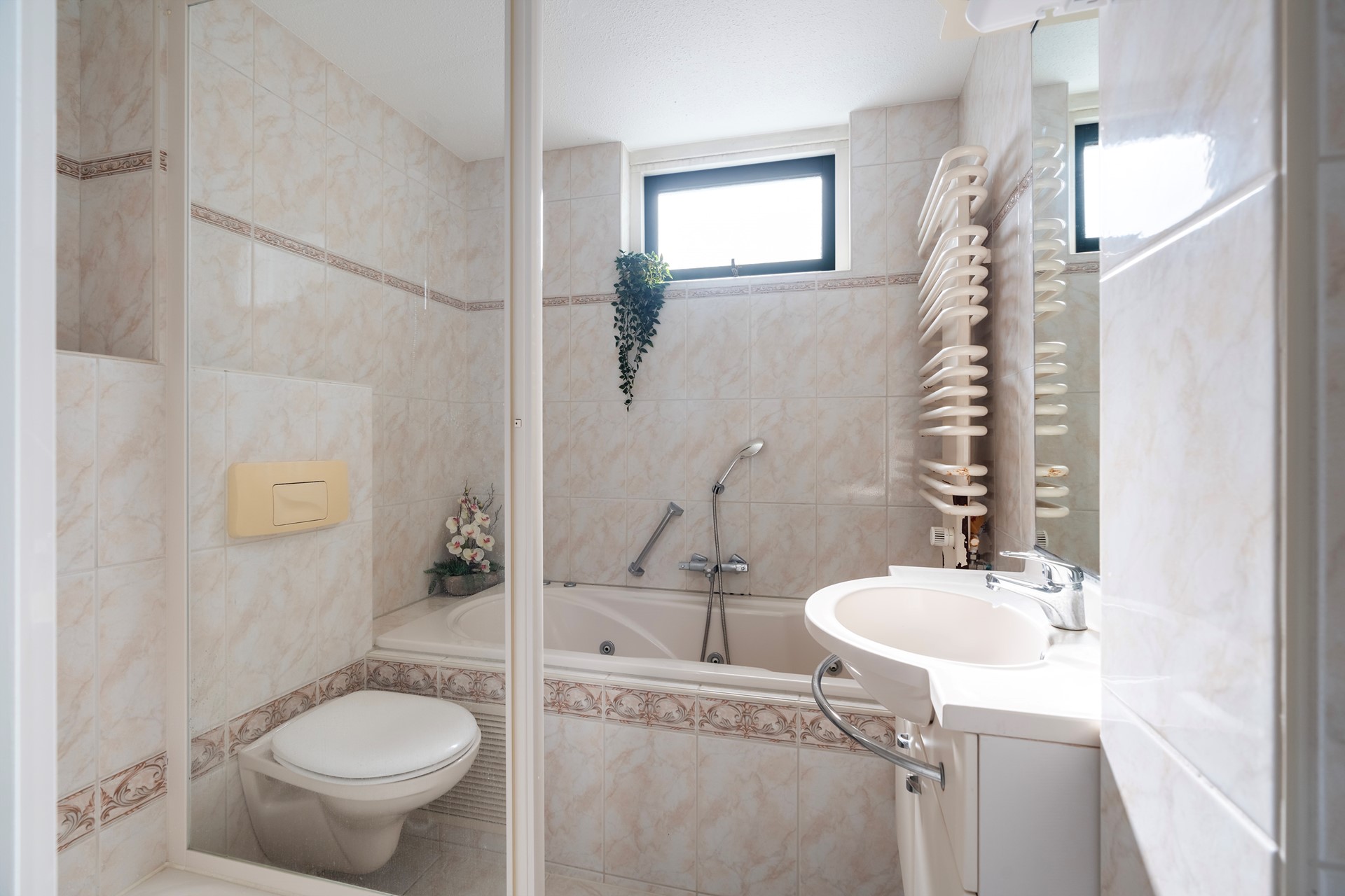 De badkamer is verzorgd, volledig betegeld en voorzien van een douchecabine met nisje, toilet, ligbad met whirlpoolfunctie en wasmeubel. Er is een radiator en bovenlichtje welke open kan en de ruimte is voorzien van mechanische ventilatie.