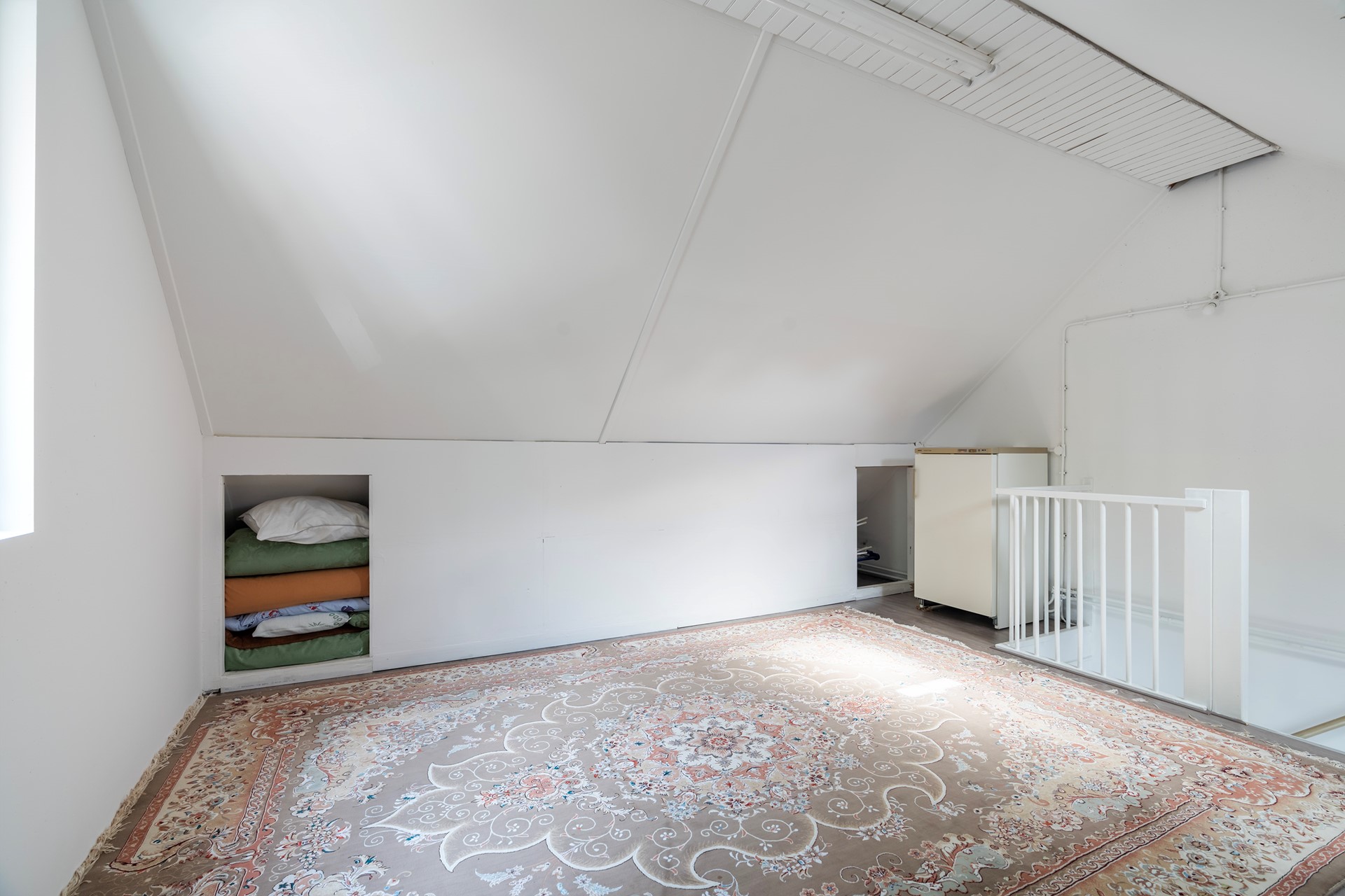 De zolder is momenteel een grote open ruimte. Ook deze verdieping is keurig voorzien van net laminaat en is volledig wit gesausd. Praktisch in de hoek bevindt zich de opstelling van de C.V.-Ketel (Intergas Xtreme 2023), de aansluiting van de wasmachine, alsook de mechanische ventilatie. De andere zijde van de ruimte is voorzien van knieschotten met praktische bergruimte.